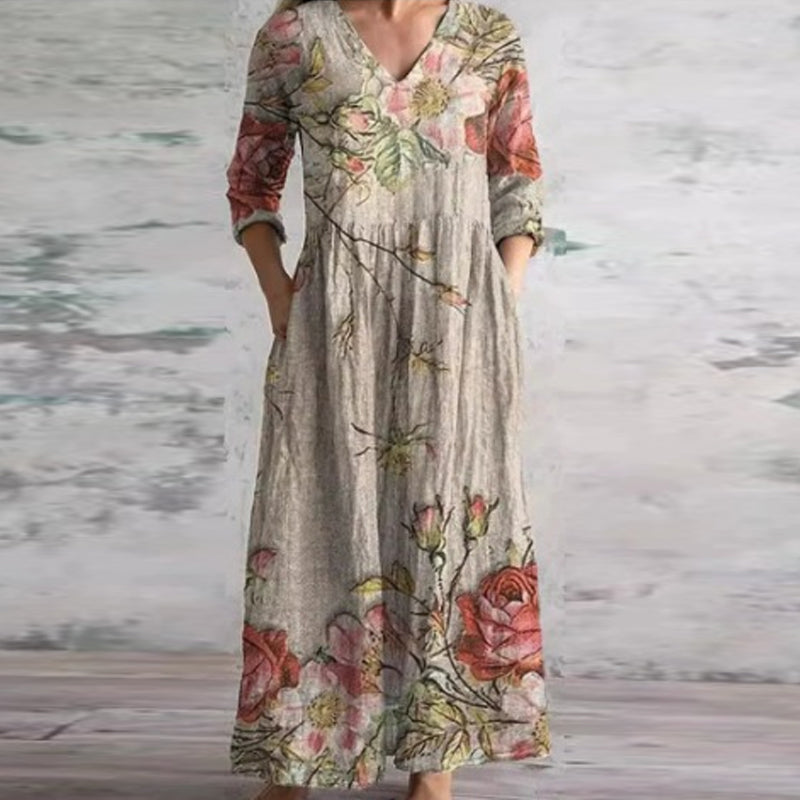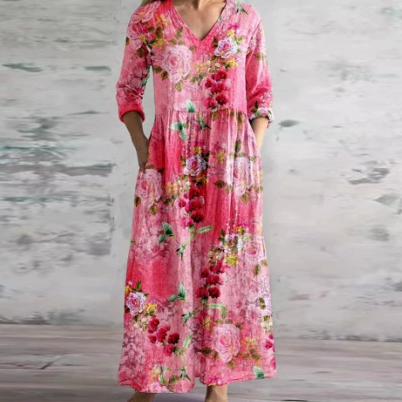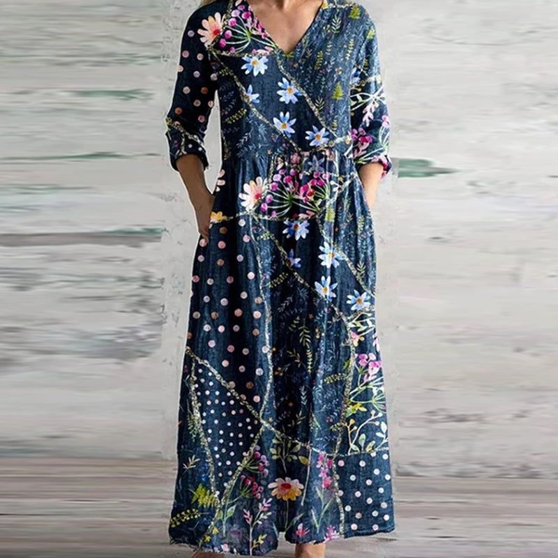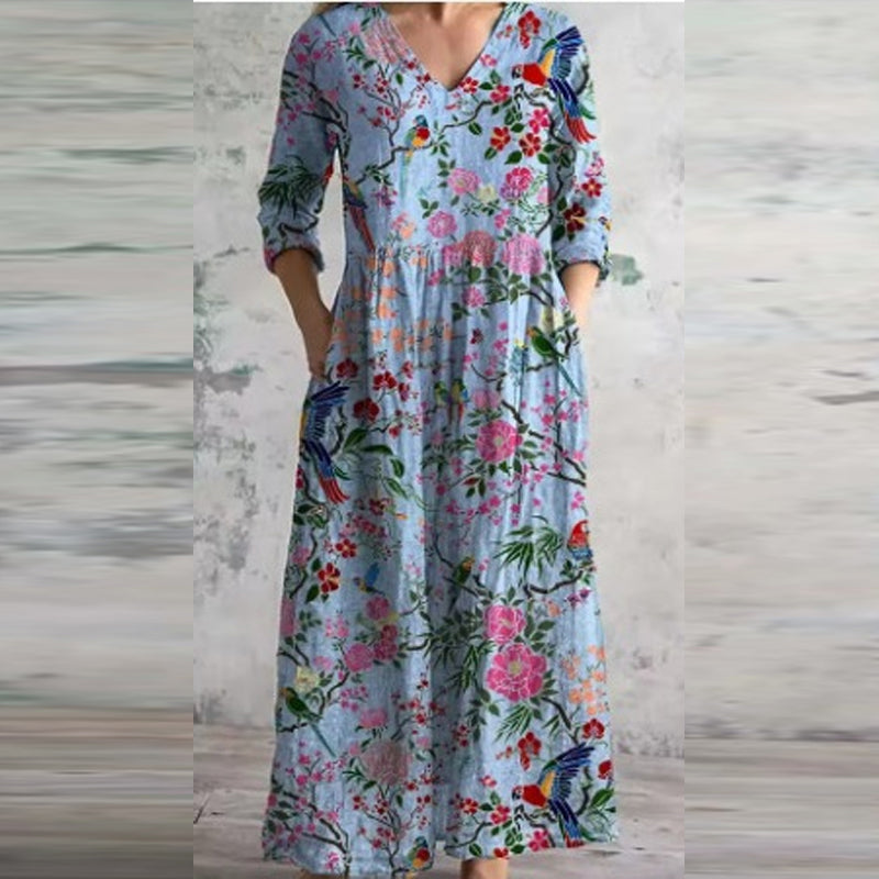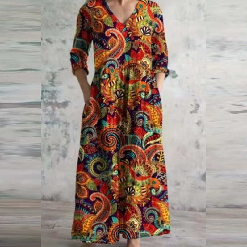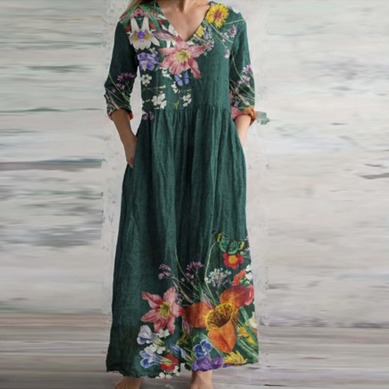 1 * Luźna sukienka z nadrukiem i dekoltem w serek