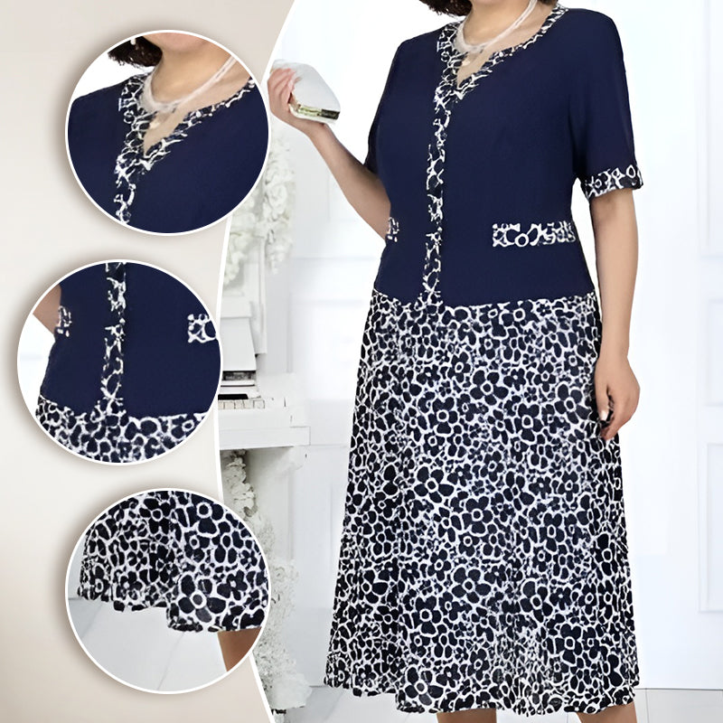 STYLOWE, KONTRASTOWE DETALE: Sukienka posiada głęboko granatowy gorset ozdobiony kwiatowym akcentem na rękawach, kieszeniach i dekolcie, co pięknie komponuje się z wzorzystą spódnicą, dodając całości eleganckiego charakteru.