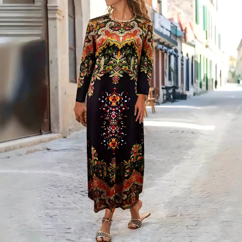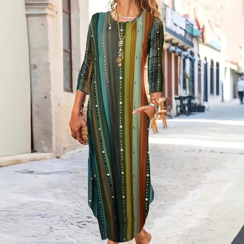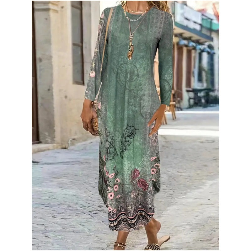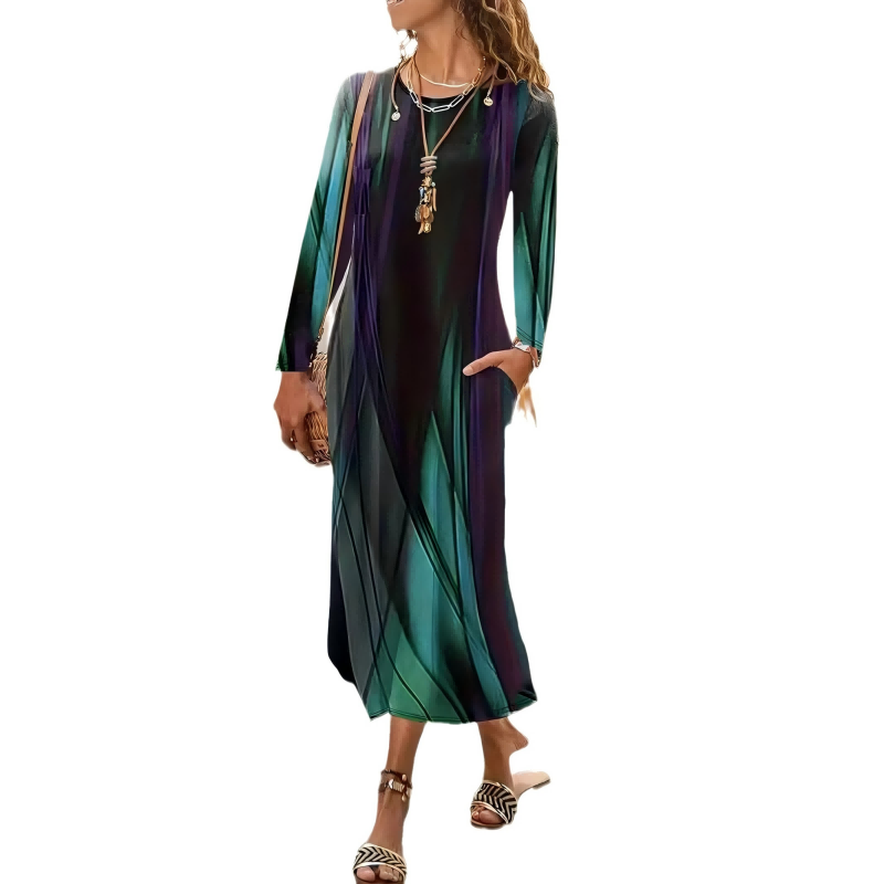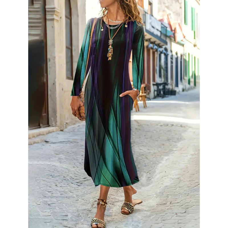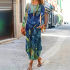 Kolory: niebieskie liście, etniczne nadruki, wielobarwne paski, zielony gradient, biały, ciemnozielony kwiatowy wzór.