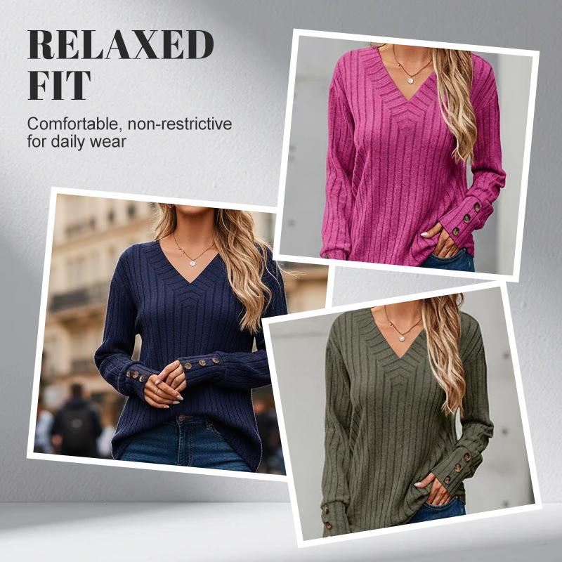 КЛАСИЧЕСКИ V-образно деколте и копчета на маншетите: V-образното деколте създава изтънчен отвор, а всеки маншет е с три декоративни копчета за елегантен вид. Тези детайли подчертават елегантността, без да засягат функционалността.